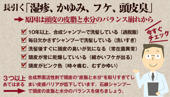 頭皮が乾燥(特に冬のみ)かきむしりをするクセがあり、血が出たり、ピンク色の跡になったり・・・。たまたま沖縄の検索しましたら、「アトピーの人でも安心して使っています」と書いてあるのをみて、実は、私もアトピーっぽいなので、本当にかゆみが出ないの?と半信半疑で購入いたしました。細かな洗い方のコツと保管のしかたなどについて、三日坊主にならないかと心配しておりました。使用しましたら、翌日、ピンク色の跡だったのか、白い肌におさまりました。